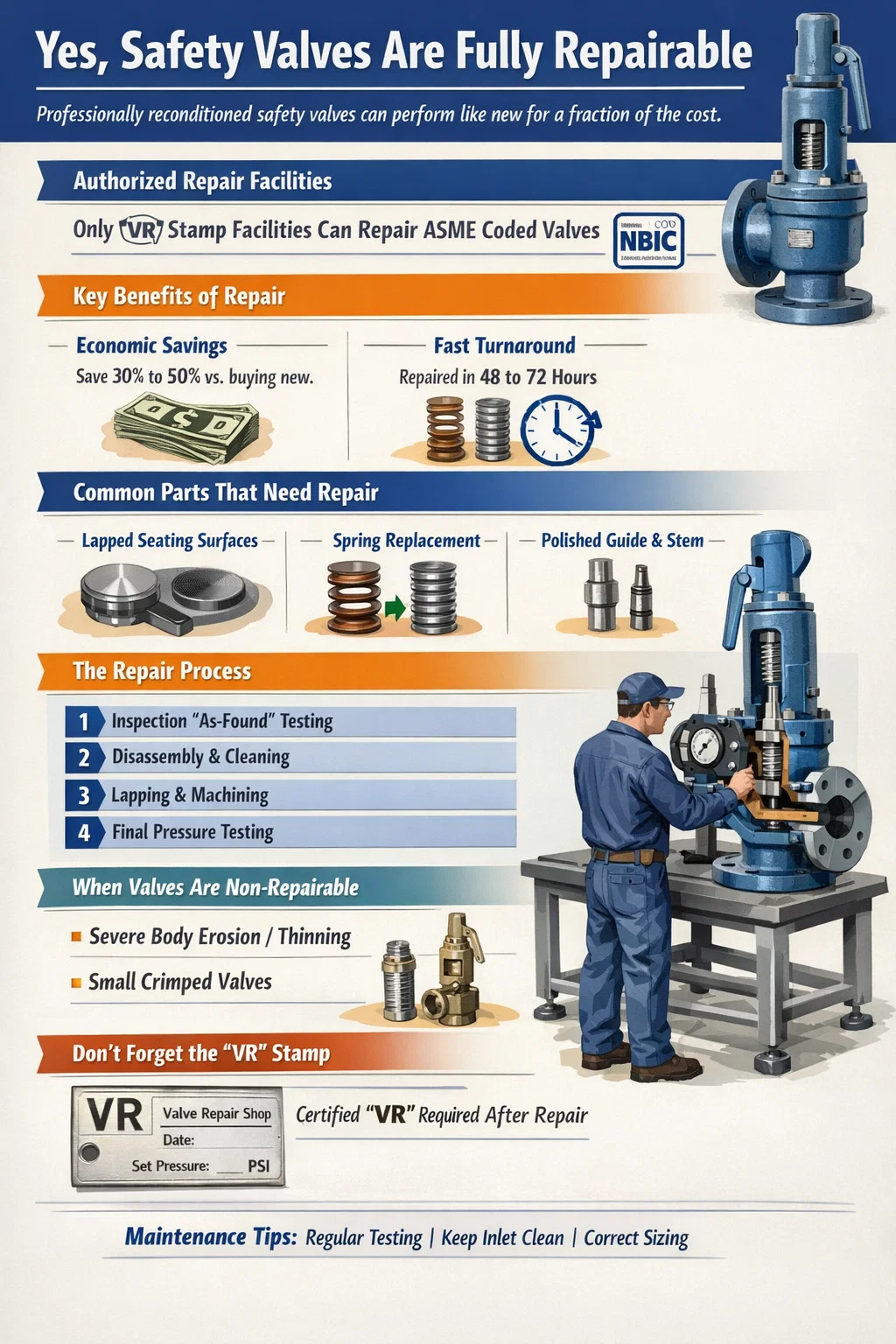 Однако «ремонт» в этом контексте — это не просто ремонт своими руками. Поскольку эти устройства являются последней линией защиты от катастрофического избыточного давления, процесс ремонта регулируется строгими нормами, такими как Инспекционный кодекс Национального совета (NBIC) и Стандарты ASME . Только авторизованным предприятиям со штампом «VR» (ремонт клапанов) по закону разрешено выполнять эти задачи на судах с кодом ASME.