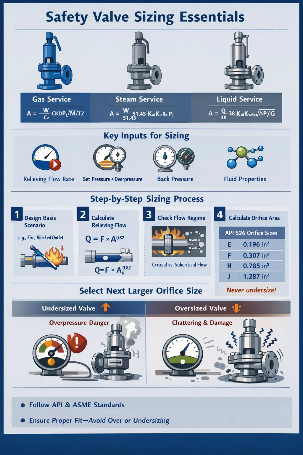 После расчета необходимой площади отверстия вы выбираете следующий стандартный размер отверстия, больший из таблиц API 526, и никогда не меньший. Предохранительный клапан недостаточного размера не может защитить сосуд; слишком большой болтается, разрушается и протекает.