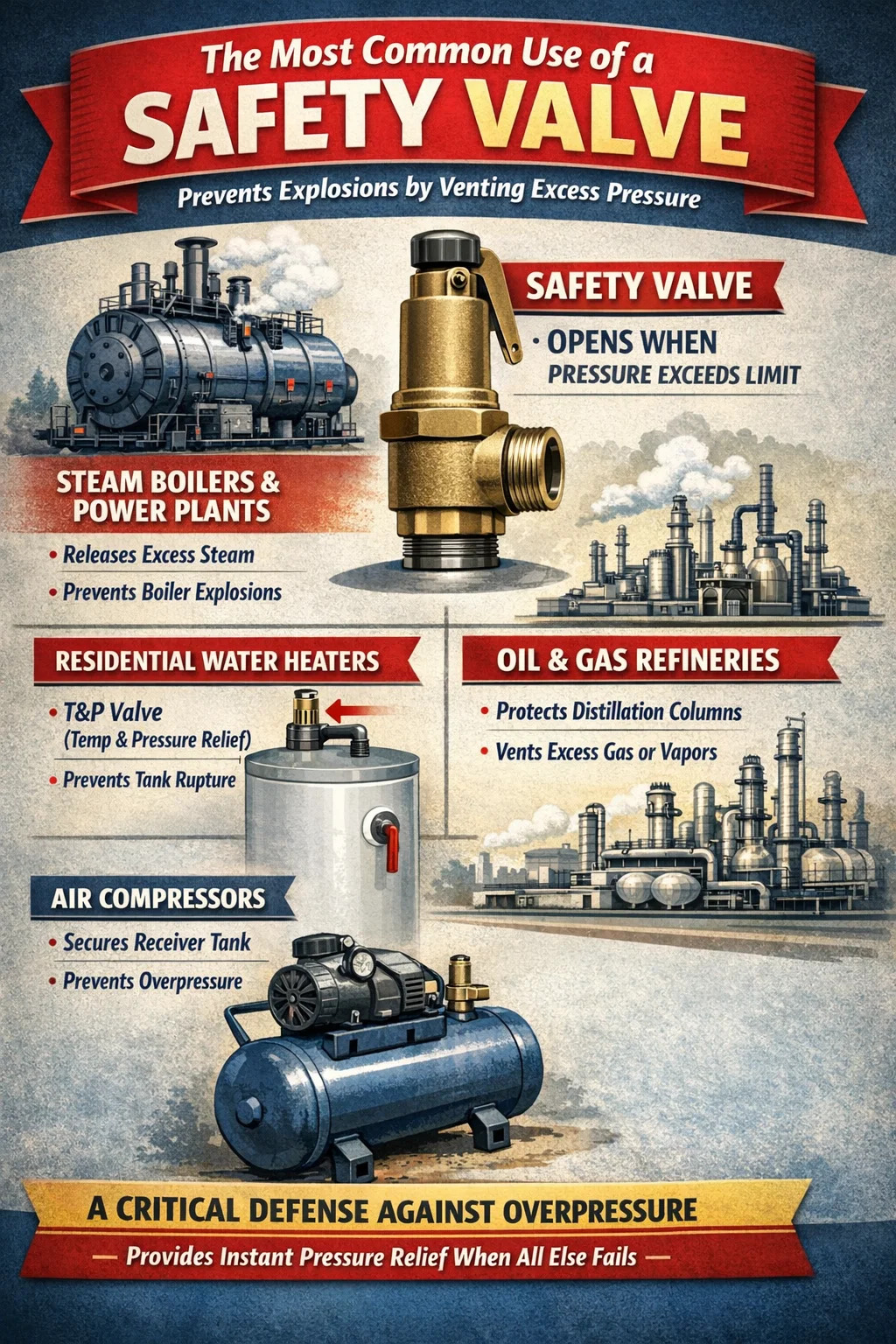 Наиболее распространенное использование А. предохранительный клапан должен действовать как надежный механизм сброса давления в паровые котлы и системы производства тепловой энергии . Его основная роль заключается в предотвращении катастрофического выхода из строя сосудов под давлением путем автоматического стравливания избыточного пара или газа, когда внутреннее давление превышает заранее определенный предел.